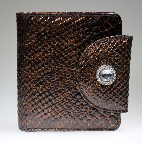 Компактное женское портмоне "Forte" с оригинальным клапаном на кнопке, декорированный ярким украшением. Изделие имеет два основных и два дополнительных кармана, монетник «коробочка», четыре отделения для пластиковых карт и одно отделение с окошком.
