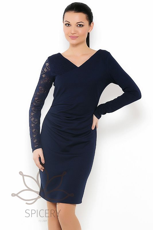 Стильное платье, выполненное из комфортного однотонного материала. Модель с кружевными рукавами и фигурным вырезом горловины. Приталенный силуэт подчеркнет фигуру.