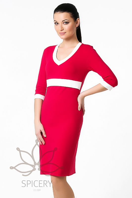 Изделие прилегающего силуэта из трикотажного полотна, украшенное отделочными элементами из контрастного материала (пояс под линией груди, манжеты и обтачка горловины).